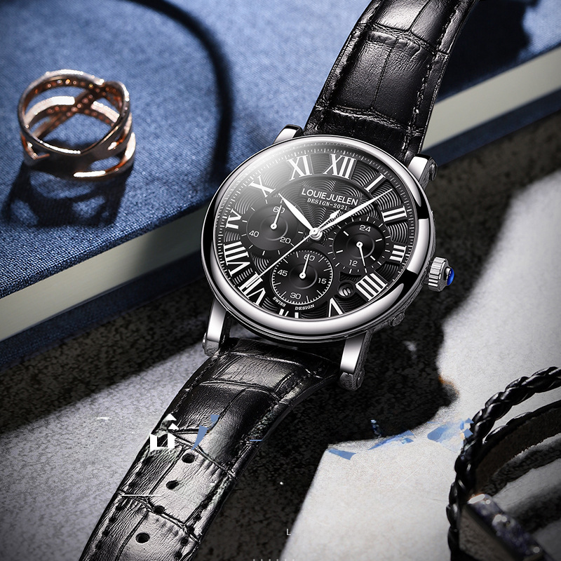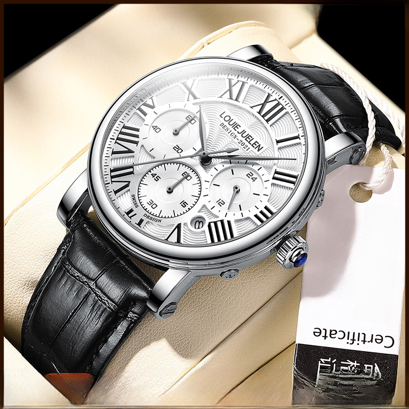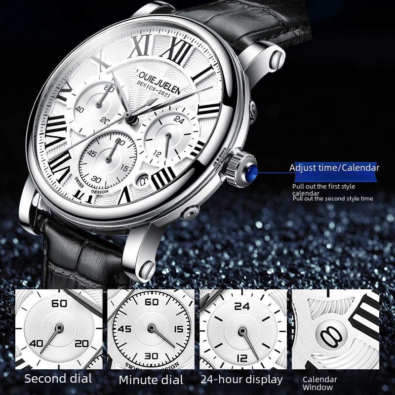 Novo relógio masculino multifuncional à prova d'água explosivo transfronteiriço, relógio masculino de quartzo com pulseira de couro genuíno de alta qualidade